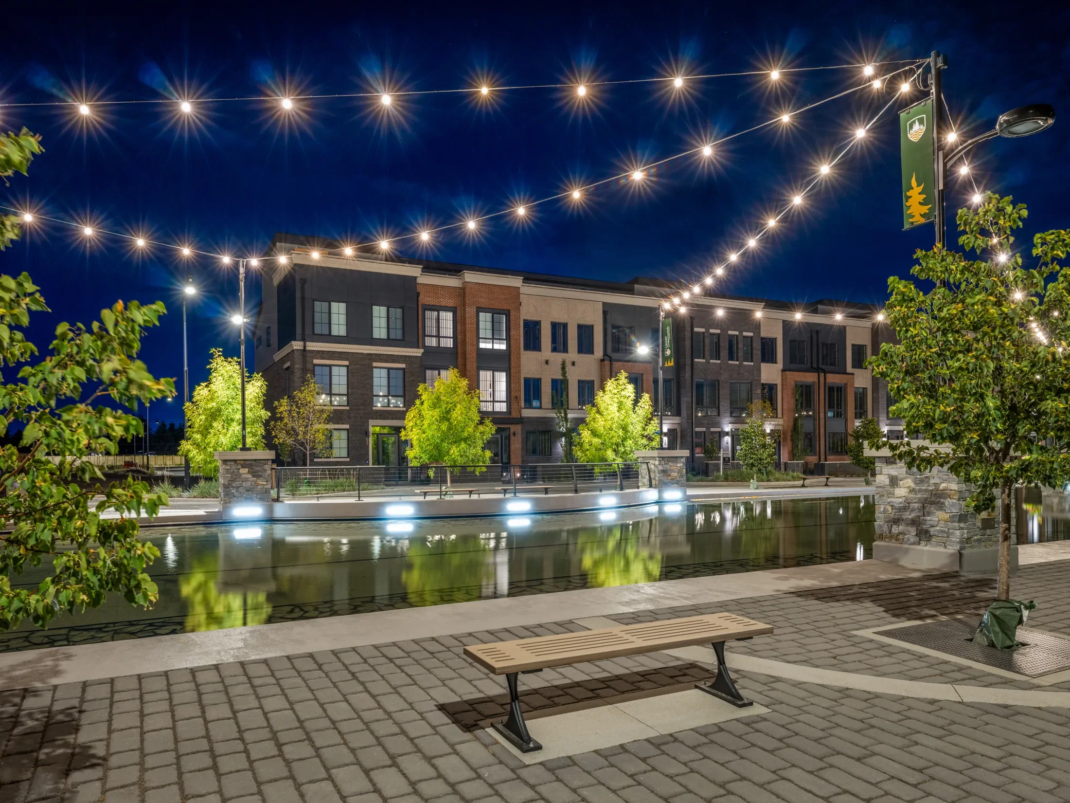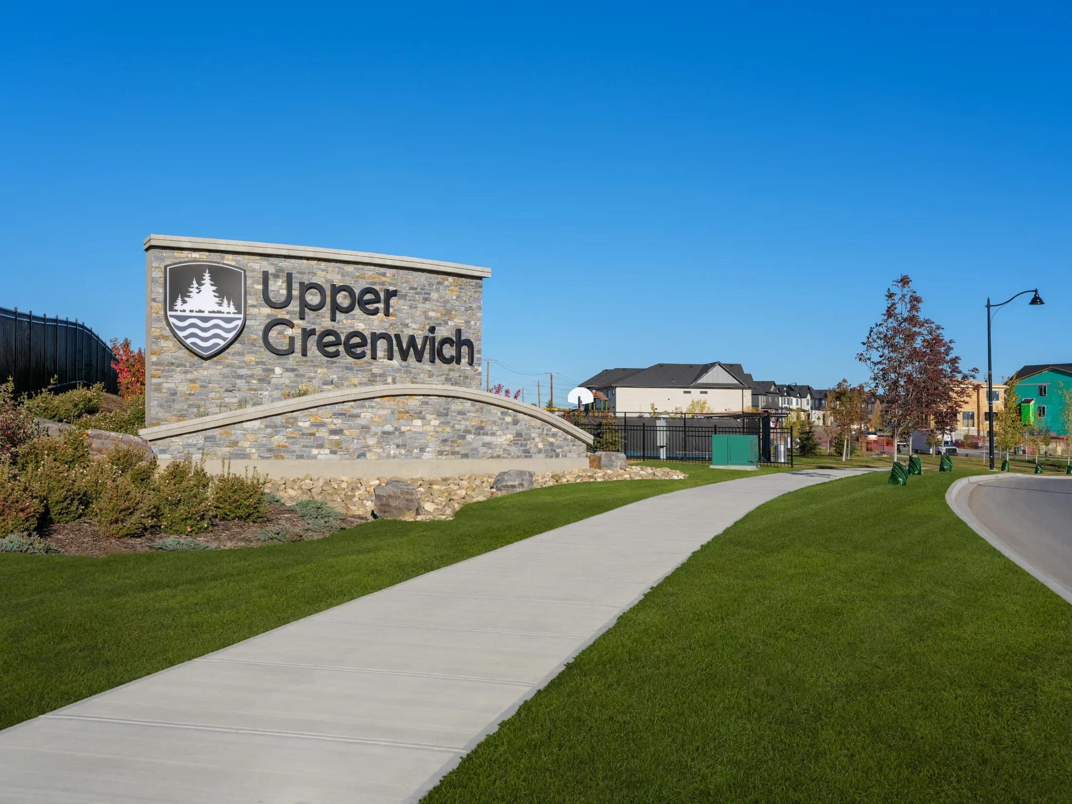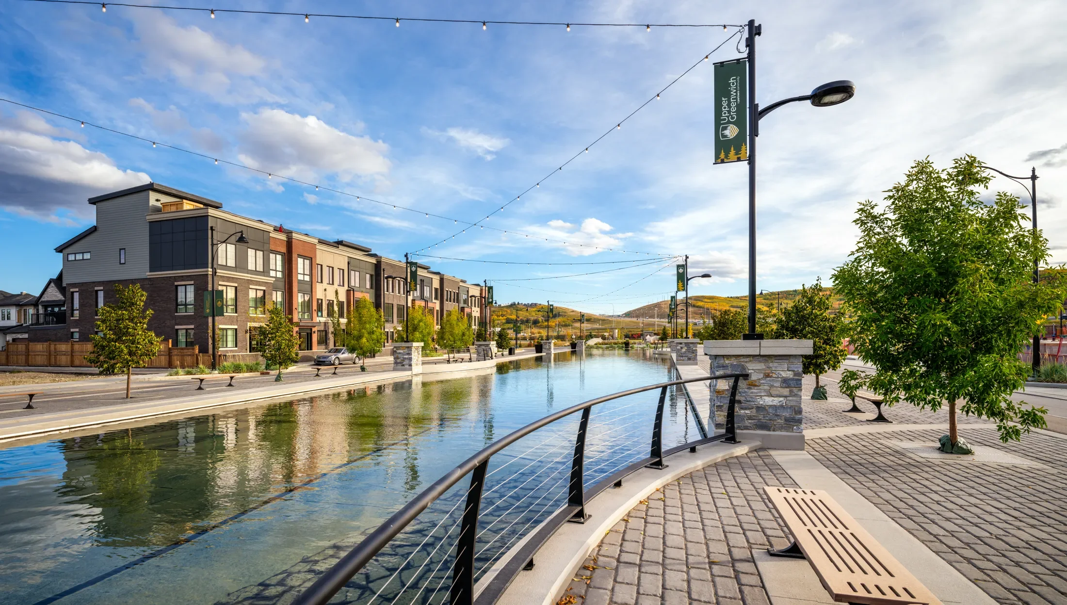 The water feature at Upper Greenwich in northwest Calgary serves as a central, canal-like focal point weaving through the heart of the neighbourhood. This linear waterway not only enhances the aesthetic and recreational appeal of the central park with boardwalk-style pathways, trees, lighting and seating, but it also creates a year-round gathering place for residents, encouraging leisurely strolls and social connection. In the winter months, this canal is envisioned to transform into a scenic outdoor ice skating surface, offering a seasonal ice-rink experience that brings an added dimension of activity and community engagement to the development’s public realm.